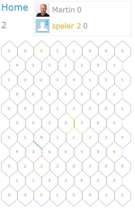 In dit geval heeft speler 2 dus net een vlak volgemaakt, hij krijg er 5 punten bij (totaal is dus 5 punten). Als je een vlak hebt volgemaakt, krijg je ook een extra beurt.