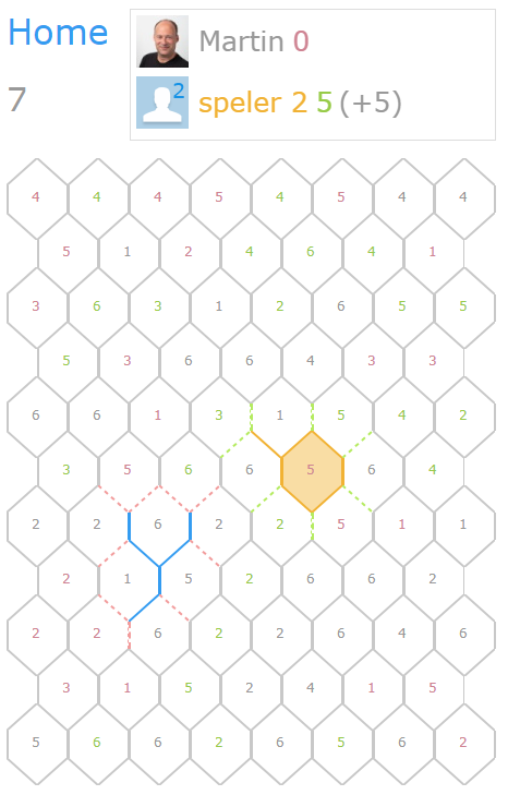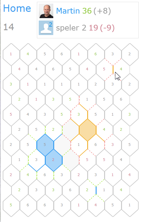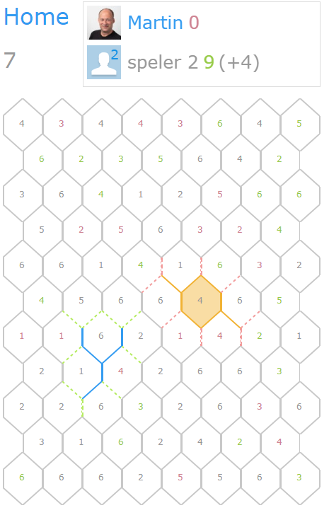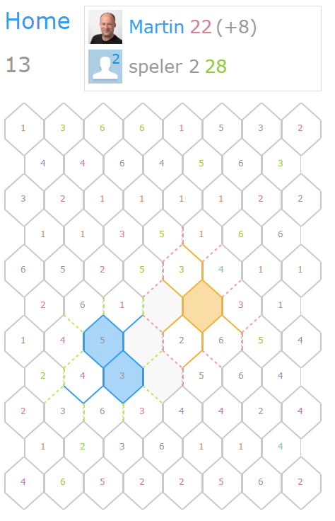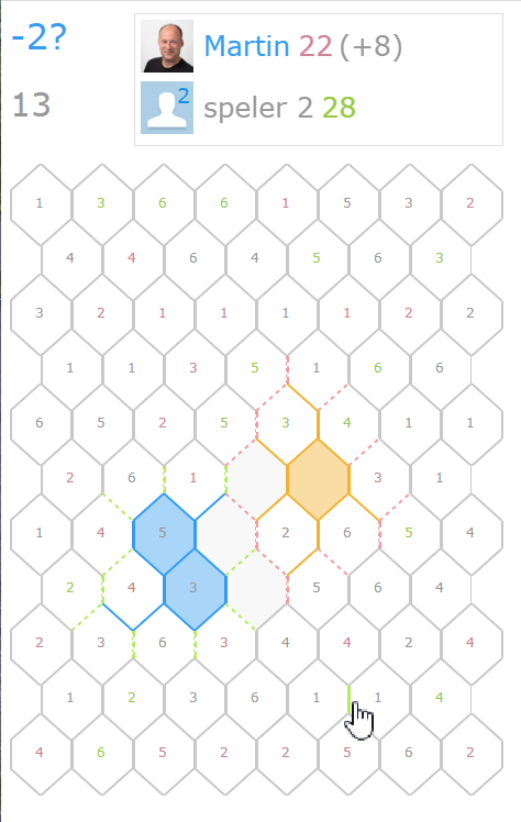 Zoals eerder gemeld is het mogelijk om een grijze lijn te selecteren waar je geen verbinding mee hebt. De 'boete' is gelijk aan de som van de vlakken ernaast en verschijnt boven in beeld. Deze actie moet bevestigd worden door nogmaals te klikken / tappen of op de boete indicator te klikken. Let op: je mag dit maar één keer doen.